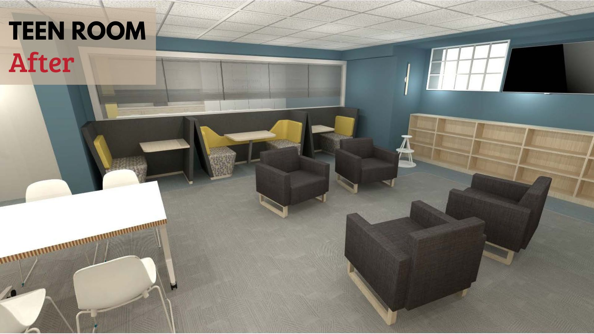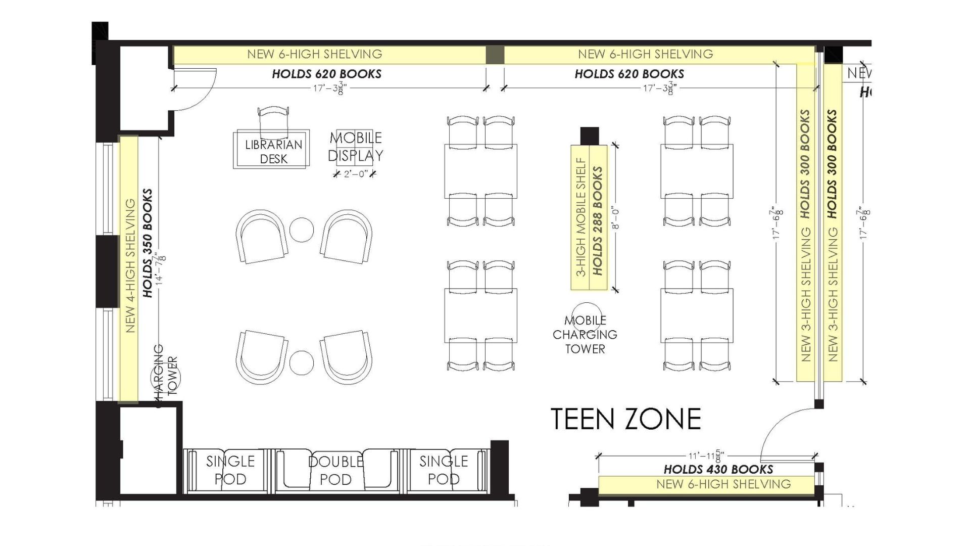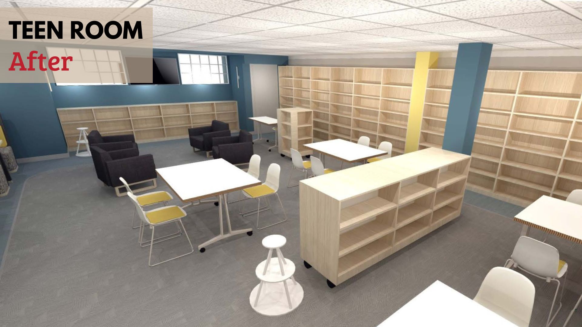 This project was the original spark for the renovation plan. The space is not sufficient for current needs. Teens are spread out over every level of the library during busy times with no space of their own.